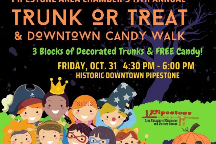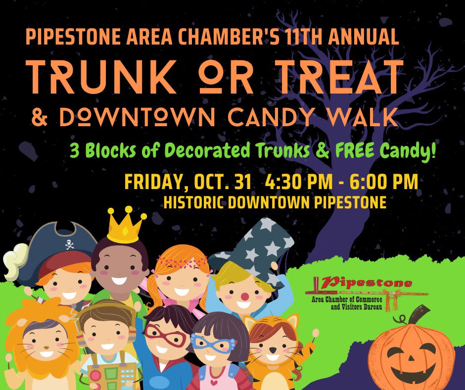 The Pipestone Area Chamber of Commerce invites you to Historic Downtown Pipestone for the FREE 11th Annual Trunk or Treat & Downtown Candy Walk on Friday, October 31st, from 4:30 pm to 6:00 pm. With about 1,000 kids annually, this community celebration for our area’s youth is a Pipestone Area favorite! Three blocks of Main Street will be closed for safe, family-friendly fun, candy, and music!