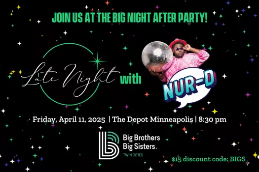 Join us a celebration of the power of mentorship and the BIG futures youth are building with the support of caring mentors. Together, we’ll hear inspiring stories from mentors and mentees, reflect on the impact of connection, and rally around our mission to ensure every young person has someone in their corner. Big Night fun begins at 5:30 - can't join us that early? Then come on by at 8:30 for Late Night and dance the night away with music by local Hip Hop artist Nur-D!