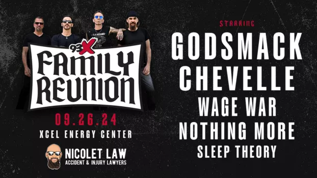 Get ready as 93X’s (KXXR-FM) much-anticipated “Family Reunion” makes its triumphant return to St. Paul, rocking the Xcel Energy Center on Thursday, September 26th. The event features an all-star lineup headlined by legendary rock giants Godsmack, Wage War, Nothing More and Sleep Theory. A well-known artist and Twin City rock fan favorite is scheduled to be added and revealed on July 22nd. Tickets on sale NOW!