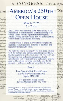 July 4, 2026, will mark the 250th Anniversary of the Declaration of Independence, and the founding of the United States. History organizations throughout Dakota County have discussed how we can accurately commemorate this national milestone.