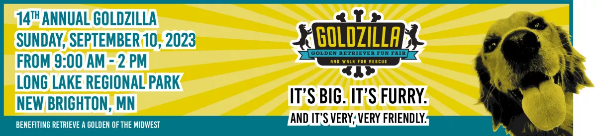 Join us for Goldzilla, Retrieve a Golden of the Midwest's annual Fun Fair and Walk for Rescue - and one of the biggest Golden Retriever events in America! All money raised supports our mission of rescuing and rehoming Golden Retrievers and Golden mixes. All dogs (and people) welcome! Activities include a Walk for Rescue, Vendor Village, food trucks, lure course, dog play areas, silent auction, wine pull, and lots of fun and games for dogs and humans alike.