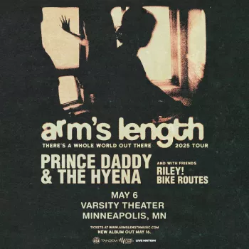 Arm’s Length is bringing the “There’s a Whole World Out There 2025 Tour” to Varsity Theater on May 6th with special guests Prince Daddy & The Hyena, Riley!, and Bike Routes! Make sure to get your tickets now!