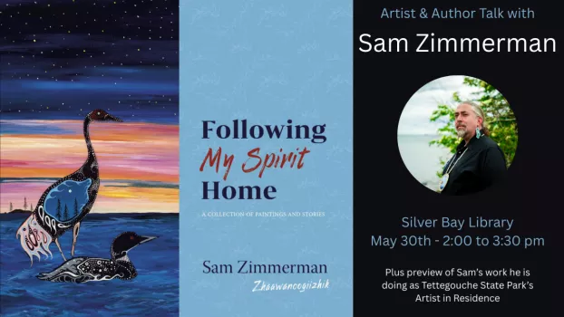 Inspired to reconnect with his Ojibwe heritage and to share it with others, artist Sam Zimmerman / Zhaawanoogiizhik returns home to family and his Ojibwe culture and relates Ojibwe stories and underlying symbols through his artwork.