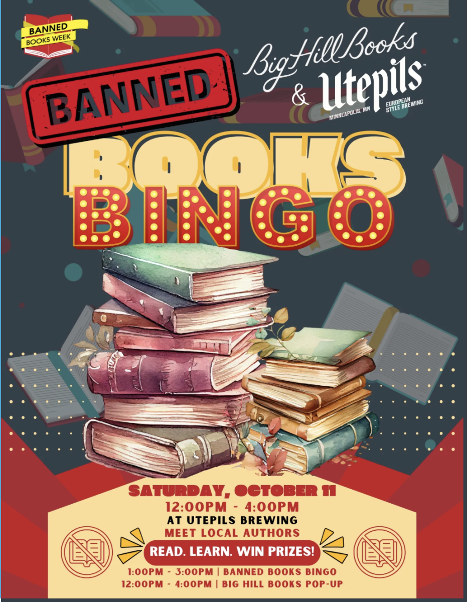 Big Hill Books and Utepils Brewing Presents Banned Books Bingo! Join us Saturday, October 11, during Banned Books Week, for a reading initiative, hosted by Big Hill Books, that encourages participants to read and learn about books that have faced censorship or challenges. Players mark off squares on a bingo card featuring specific banned or challenged books, authors, or related themes, with the goal of completing a line to "win" bingo and be entered into a prize drawing or simply to promote the freedom to read. • 12:00PM - 4:00PM | Big Hill Books pop-up• 1:00PM - 3:00PM | Big Hill Books hosts Banned Books Bingo• Meet local authors!• Food Truck | Cuchillo | 12:00PM - 8:00PM Come support, learn and enjoy!