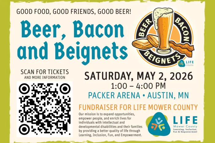 A fun event where drinking beer, eating bacon and beignets supports LIFE Mower County. This nonprofit organization empowers people, enriches lives for individuals with Intellectual and developmental disabilities.