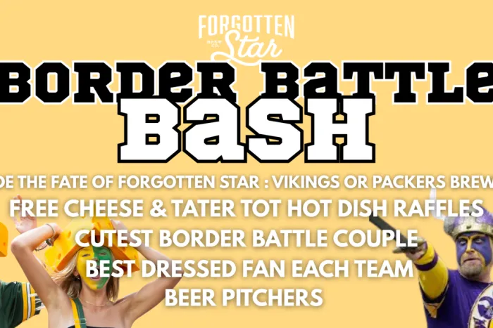 Packers or Vikings? Decide the fate of Forgotten Star for the remainder of the NFL season on November 23 when the Packers face the Vikings! And that's not all...Join us for a watch party featuring prizes for the best dressed fan on each team and the cutest border battle couple, plus a FREE cheese and tater tot hot dish raffle, beer pitchers and $5 Gridiron Irish Dry Stouts.Fans will cast a single vote for the fate of whether or not Forgotten Star remains a Vikings spot, or turns into a Packers spot for the remainder of the season!Enjoy food from the Hodgepodge food truck, PLUS Purple People Feeders will be joining us serving up the eats as well!