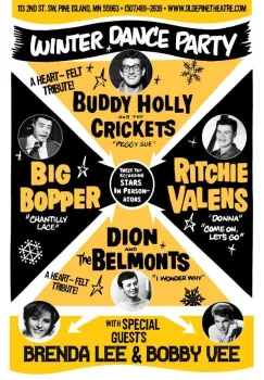 Join us at the Olde Pine Theatre for a re-creation of the February 2nd, 1959 Winter Dance Party.In January, 1959, Buddy Holly, Ritchie Valens, J.P. “The Big Bopper”, Dion and the Belmonts, Frankie Sardo, Waylon Jennings, Tommy Allsup and Carl Bunch set out on a 24 day tour barnstorming the Midwest. It became the most infamous tour in rock ‘n roll history.