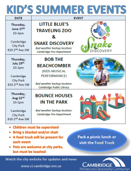 Cambridge, MN hosts three KID'S SUMMER EVENTS each year.