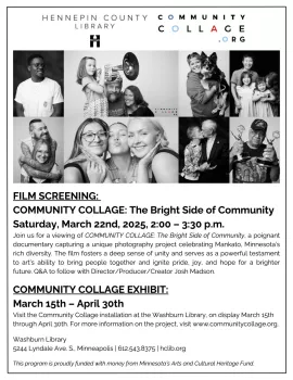 Join us for a viewing of COMMUNITY COLLAGE: The Bright Side of Community, a poignant documentary capturing a unique photography project celebrating Mankato, Minnesota’s rich diversity. The film fosters a deep sense of unity and serves as a powerful testament to art’s ability to bring people together and ignite pride, joy, and hope or a brighter future. Q&A to follow with Director/Producer/Creator Josh Madson.