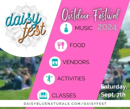Join us for a day of outdoor fun and holistic wellness at Daisy Fest Outdoor Festival, happening on Saturday, September 7th, in the picturesque Albert Lea, Minnesota! Family & pet-friendly event featuring live music, enlightening classes, vibrant vendors, captivating demos, and much more, all celebrating the essence of natural living and holistic wellness. Don't miss out on the special musical performances by Root River Jam and Bourbon Stiletto! All are welcome!