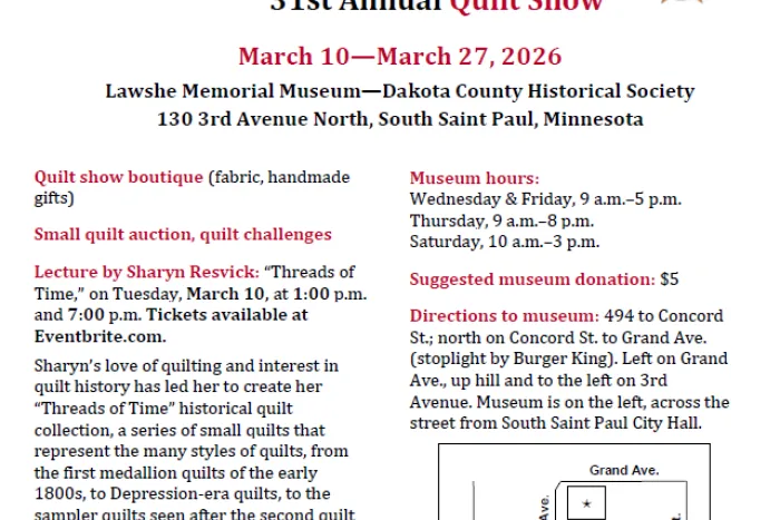 The lecture is presented in conjunction with the Dakota County Star Quilters' 31st Annual Quilt Show "A Parade of "Quilts" . Admission to the show is included.