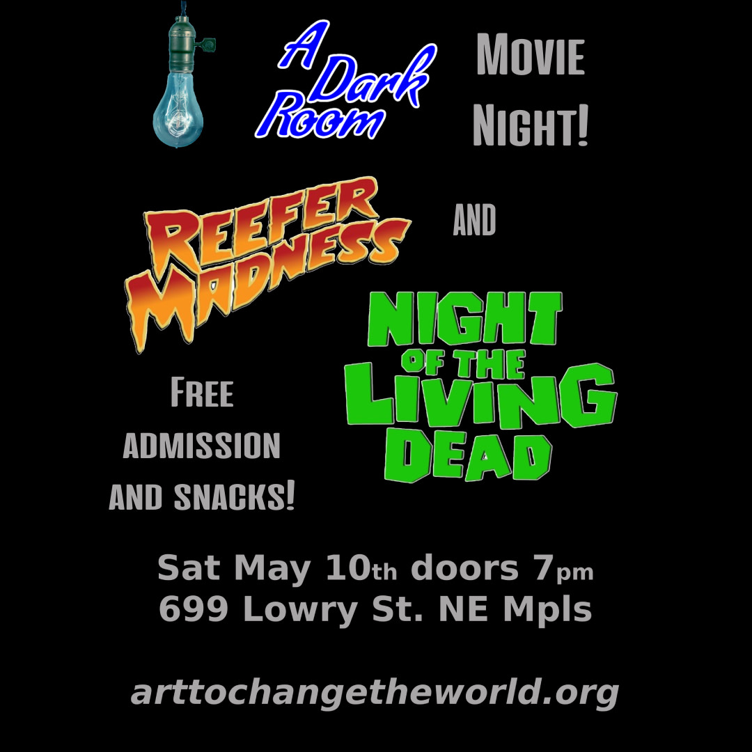 A free double feature movie night! REEFER MADNESS and NIGHT OF THE LIVING DEAD! Free popcorn and drinks too! Doors 7pm, showtime 7:30pm. Straglers are welcome.