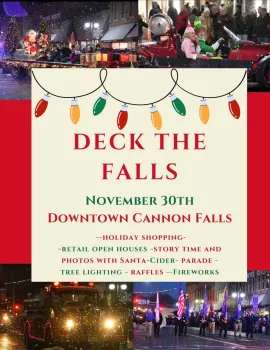Begin the day enjoying delicious pancakes at the fire station, then head to various Cannon Falls businesses to get your holiday shopping done and maybe treat yourself to a gift! After you've checked off your Christmas lists, listen to Santa read a story at the Cannon Falls Library then stop and get your picture with him and Mrs. Claus at CannonBelles! Next, grab some chili from Tilions and find a spot along the festively lit 4th street to watch the lighted Deck the Falls Parade, watch for the special guest at the end! Follow the merry crowd to city parking lot where you can grab a cup of hot cider, join in on carols, maybe collect a prize if you are one of our lucky raffle prize winners and then watch as this magical night comes to an end with some festive fireworks! And who knows, if you look real close you may even see Santa flying his sleigh off into the night...www.cannonfalls.org