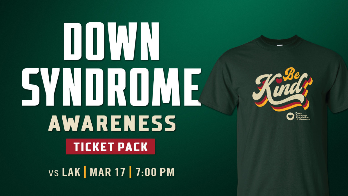We invite you to a night of empowerment and celebration on March 17th as the Wild host the Kings. This package supports the Down Syndrome Association of Minnesota's mission to empower individuals and families, to create community and to celebrate people with Down syndrome. Your package includes a game ticket and a "Be Kind" t-shirt, with a portion of each shirt's proceeds donated to support the Down Syndrome Association of Minnesota.