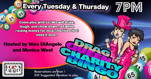 We will feature a different local non-profit each week and raise money for them by playing BINGO ! There will be amazing prizes and performances by your hosts Nina DiAngelo and Monica West. There is a $10 suggested donation and we play about 10 games of Bingo, on our HUGE LED wall ! See you there !