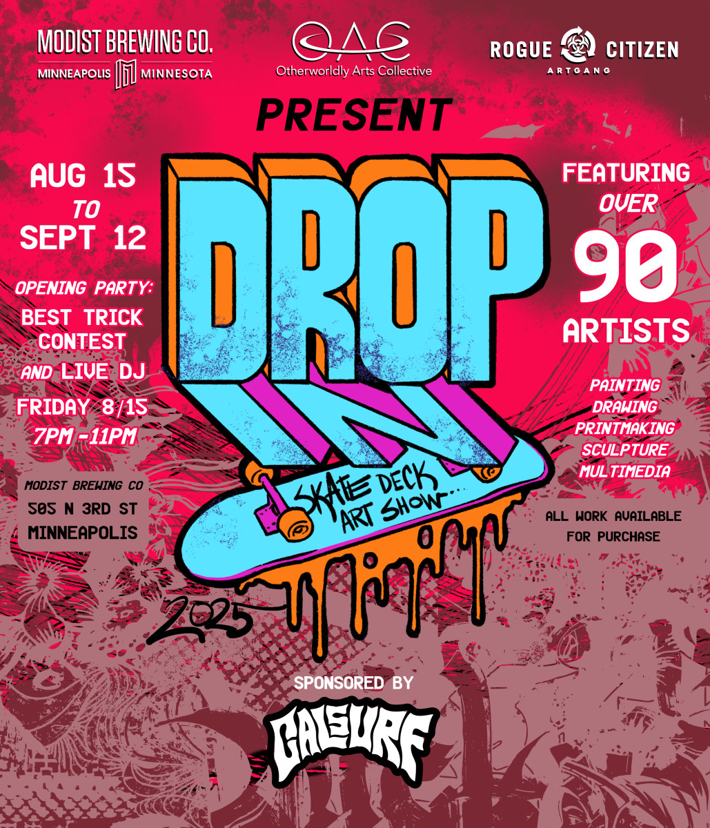 Join us in the taproom for the opening party of 2025 Drop In, a skate deck art show presented by Otherworldly Arts Collective and Rogue Citizen Artgang, sponsored by Cal-Surf. Like every year, there is a full display of tricked out skate decks from over 90 artists that are all available to purchase. But that’s not all, there’ll be a Live DJ and a best trick contest in the back room. So come hang out and watch some of Cal-Surf’s best skaters.