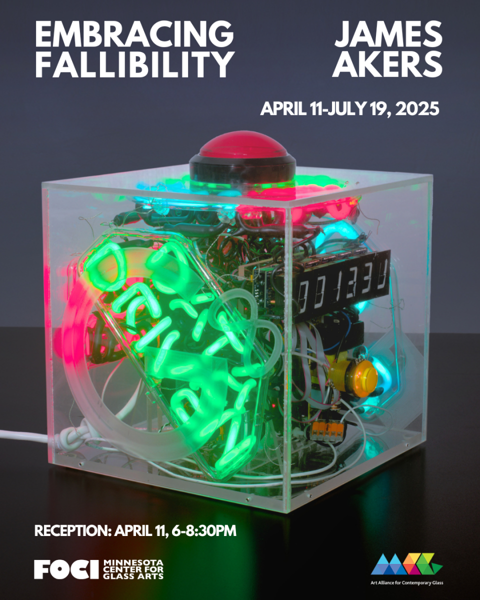 James Akers is a Brooklyn, New York based artist working with glass, computers, and electricity. Akers grew up in Maryland skateboarding, playing guitar and hacking video games. He received a BFA from Alfred University in 2015 and currently operates a neon fabrication company called Nebula Neon with his partner, Ali Feeney. His artwork has been shown in museums, galleries, fairs, and homes around the world.