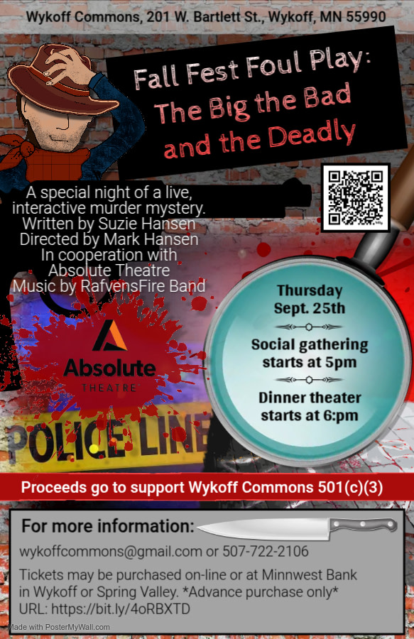 Wykoff Commons Presents: Fall Fest Foul Play: The Big the Bad and the Deadly A dinner theater murder mystery written by Suzie Hansen and directed by Mark Hansen, in cooperation with Absolute Theatre Join us for a thrilling evening of mystery at Wykoff Commons in Wykoff, MN. This event promises an exciting night filled with mysterious twists and turns. Step into the world of intrigue and suspense as you navigate through a web of clues and suspicious characters.