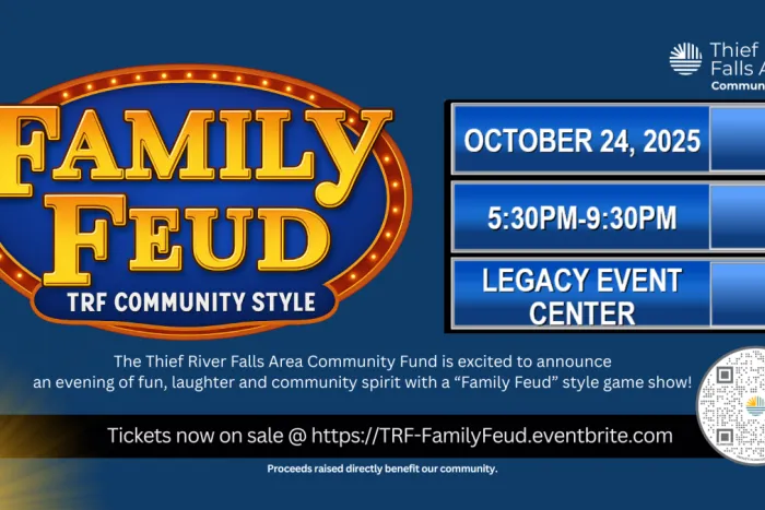 The Thief River Falls Area Community Fund is excited to announce an evening of fun, laughter and community spirit with a "Family Feud" style game show! Mark your calendars for October 24, 2025. Tickets are on sale now for $65 and include a reserved seat and delicious three-course meal. Tickets must be purchased in advance through Eventbrite @ https://TRF-FamilyFeud.eventbrite.com Reserve your seat today!