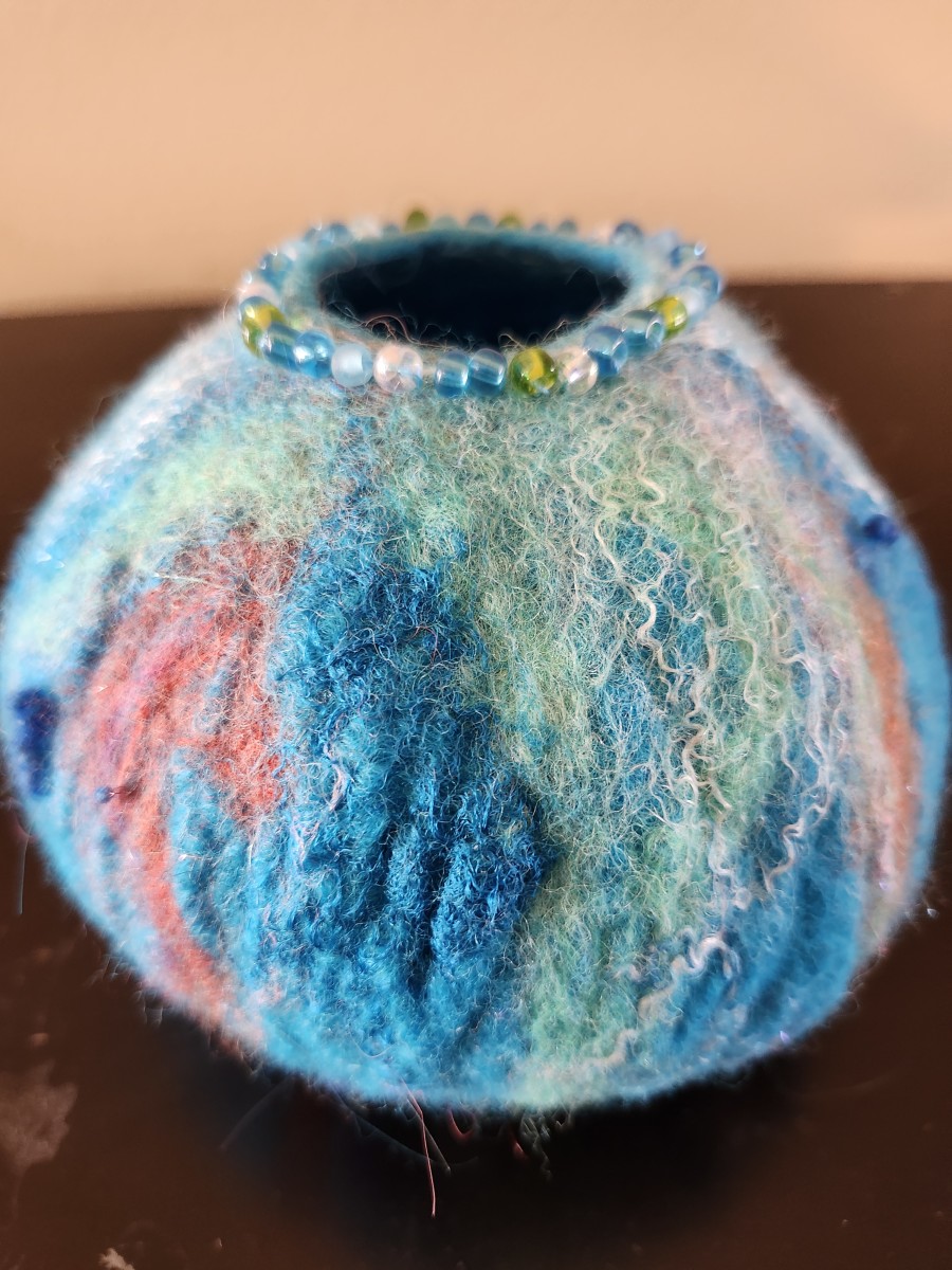 Explore the magic of wet felting by creating a one of a kind vessel or vase! You will use some wool, a resist, some soapy water and agitation to create a beautiful, but practical vessel that can hold little trinkets, jewelry or artificial flowers. Students will be able to choose your colors and add embellishments to make it unique and one of a kind! Additional options for adding beads will also be available. Instructed by Bobbi Hoppman of Witty Knitty Designs.