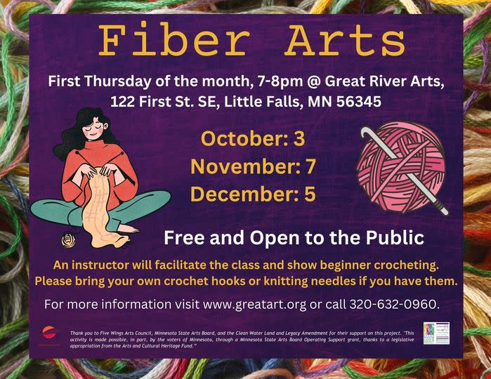 Fiber Arts Club at Great River Arts will be on the first Thursday of each month from 7 - 8 p.m. Please bring your own crochet/knitting hooks and needles. If you are working on a project, feel free to bring it along as well!