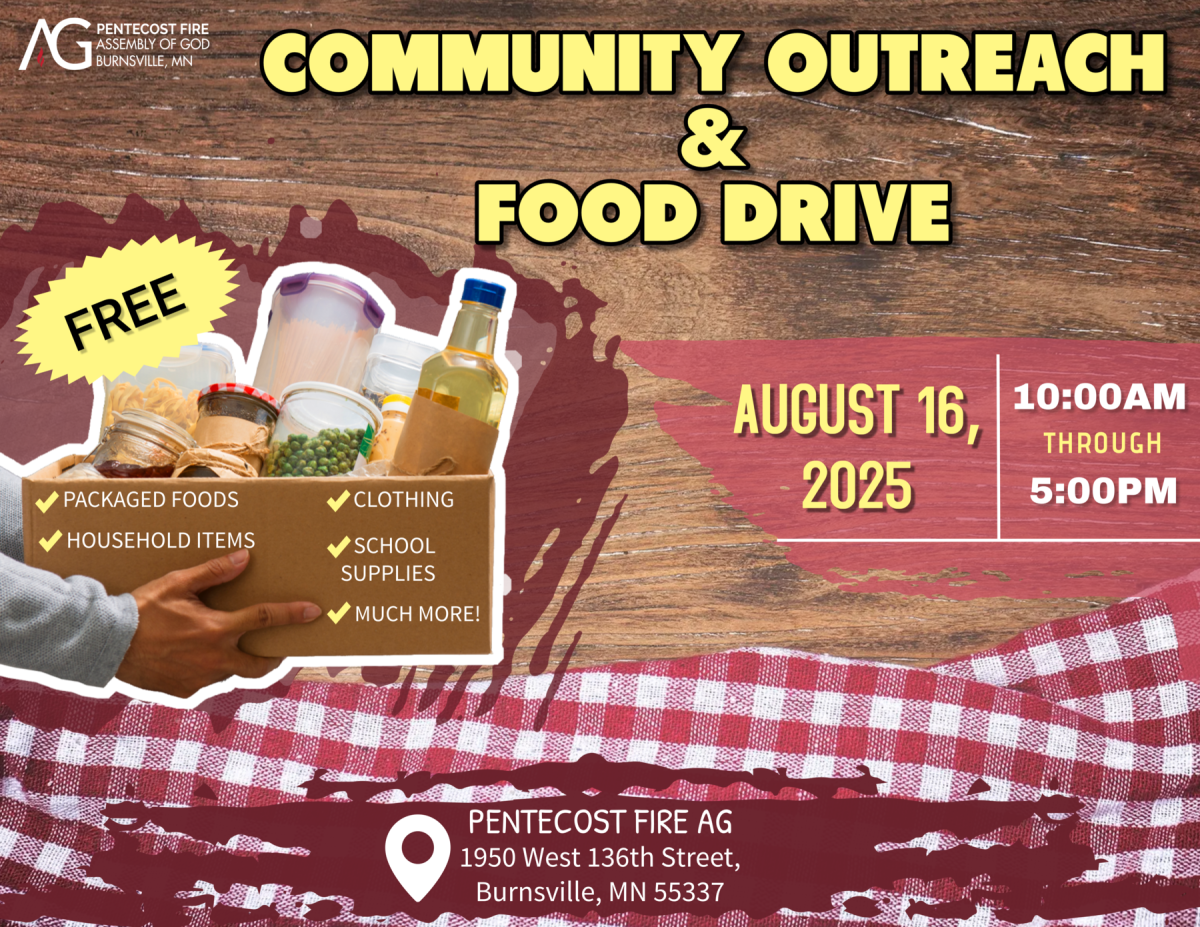 Pentecost Fire Assembly of God is hosting their annual Food Drive/Community Outreach on August 16, 2025 from 10am – 5pm. During this time we will be giving away packaged foods, school supplies, hygiene products, utensils, and more. This event is absolutely FREE (while supplies last)! Our goal is to give back to our community and also evangelize and pray with anyone in need. We would love for you to stop by. Please note items will be given on a first come first serve basis.