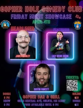 Experience live standup comedy in The Hole! Featuring the best rising comedians in Minnesota! Our Friday night showcase at the Gopher Hole is conveniently located inside the Gopher Bar & Grill in West Duluth. Come in early and grab a bite to eat! $1 off all apps with purchase of ticket! Food is available until 9PM. Cold drinks served all night...well until the bar closes! Doors: 8PM Show: 9PM Headliner: James Stanley Featuring: Lucy Beers Shenk Host: Dustin Fawcett