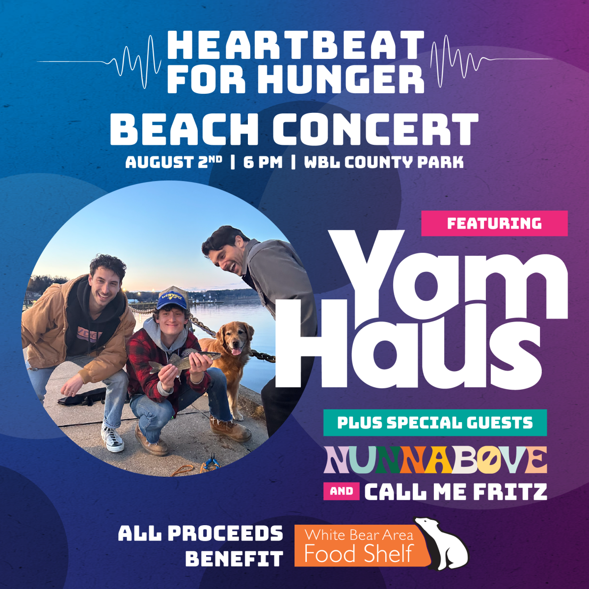 Summer at its best, a beachside concert! Heartbeat for Hunger and White Bear Area Food Shelf are thrilled to announce a new summer event. On Aug 2 join us at White Bear Lake County Park for a concert featuring Yam Haus, NUNNABOVE, and Call Me Fritz on the beach. Great music, delicious food, and memorable summer fun, plus thanks to Walser, you can win a 2-yr lease of a Mazda CX-30 or Chevy Trax! All proceeds from the event support the local White Bear Area Food Shelf. Tickets are $20.