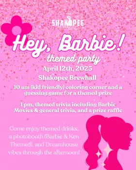 Hey Barbie! Join us Saturday, April 12th for a day of fabulous fun! Kids' activities kick off at 10 AM with a coloring corner and Barbie-themed guessing game. At 1 PM, you can enjoy Barbie trivia, raffle prizes, and themed drinks. Every drink earns a raffle ticket, so sip, sparkle, and win!