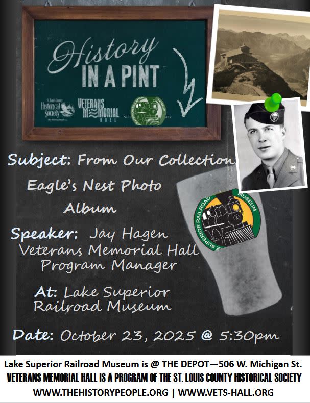 Veterans Memorial Hall, a program of the St. Louis County Historical Society, and the Lake Superior Railroad Museum announce their next event in the local history presentation series, History in a Pint.