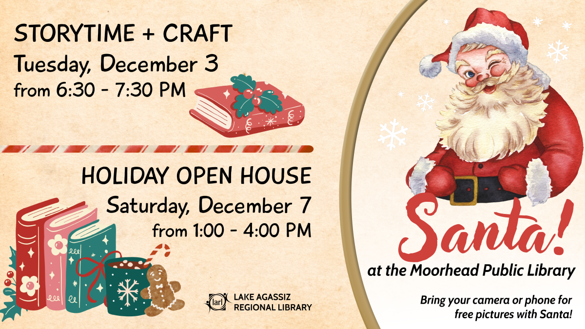Join the Friends of the Moorhead Public Library for a festive event featuring refreshments, a mini book sale, and a visit with Santa!