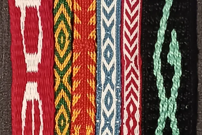 This class will introduce students to the basic technique of tablet weaving. Tablet weaving uses perforated tablets, also called cards, to organize the warp yarns. The cards are threaded with colored yarns, and the order in which the weaver turns them creates the pattern. We’ll use a simple post loom to make a sampler, and students will take their cards and three easy patterns home to try later.