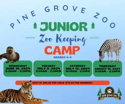 Did you know that ALL animals have 4 things in common? Would you like to know what those things are? Campers at our Junior Zoo Keeper Camp will learn these common traits as well as many traits that are unique to specific species. This summer camp will give young animal lovers an opportunity to experience the wonders of wildlife and nature in fun and exciting ways. The Junior Zookeeper Camp is designed for Grades 4-6. The cost is $85.00 per child ($75.00 for members). Pre-Registration is required. Lunch, a water bottle, and a t-shirt are included!