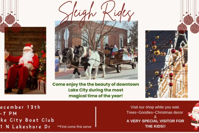 Come enjoy the beauty of Lake City during the Holidays with a sleigh ride through town. Sleigh rides will be on a first come basis. Enjoy hot cocoa, cookies, holiday shopping & Santa while you wait!
