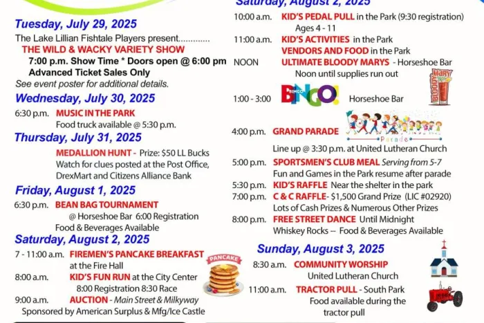 Events include a scavenger hunt, bean bag tournament, pancake breakfast, kids’ tractor pull, BINGO, and a Grand Day Parade!