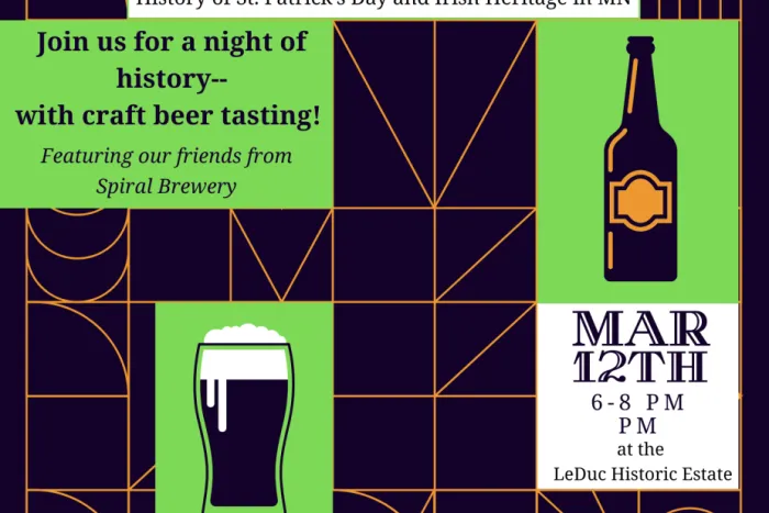 Get ready for St. Patrick’s Day by learning about its origins and traditions, all while enjoying beer samples from our friends at Spiral Brewery! We will have a presentation on the holiday, history of the beverage, and learn about Irish heritage in Minnesota, all at the Historic LeDuc Estate. Must be 21+ to taste samples.