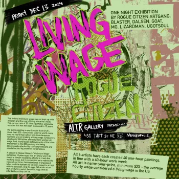 A sequel to Rogue Citizen’s “Minimum Wage” exhibition 10 years ago, this art show won’t do much to thwart escalating efforts to crush the working class, but it can remind us to rethink the value of our time, the importance of organized labor, and the system we’ve been raised to accept without question. And it’s over 240 works of art that are funny, weird, beautiful, ugly, and as affordable as they can be.