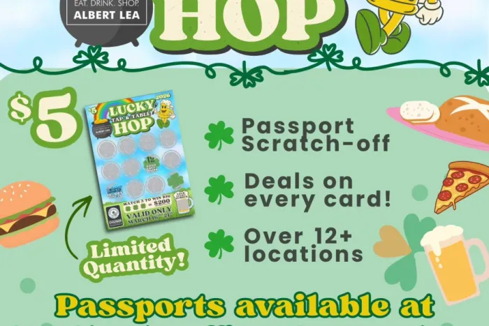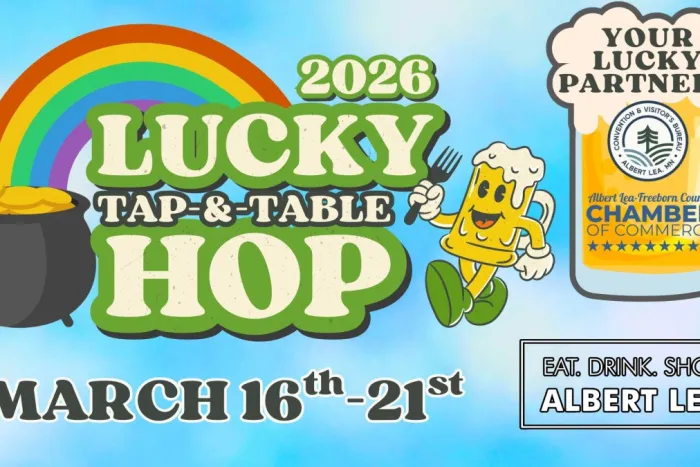 Participating bars & restaurants in Albert Lea & Freeborn CountyGet ready to sip, savor, and scratch your way through St. Patty’s Week! The Albert Lea Convention & Visitors Bureau and the Albert Lea-Freeborn County Chamber of Commerce are teaming up to bring you Lucky Tap & Table Hop — a community-wide food and drink event designed to celebrate our amazing local bars and restaurants all week long. Scratch tickets available for purchase at CVB/Chamber office and 112 on Broadway.