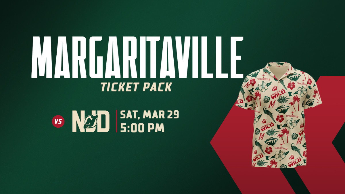 Join us on March 29th where the margaritas won't be the only thing frozen. This package includes a game ticket to watch the Wild take on the Devils and an exclusive Wild x Margaritaville inspired Hawaiian Shirt.
