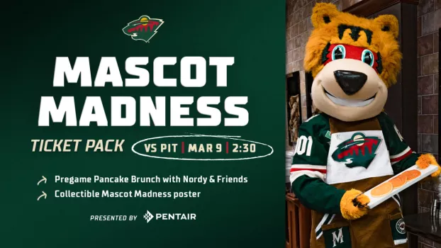 Join us on March 9th for our Mascot Madness Ticket Pack presented by Pentair! We welcome you to a pre-game brunch with Nordy, and his NHL mascot friends. This package includes your game ticket, brunch and a collectable Mascot Madness poster.