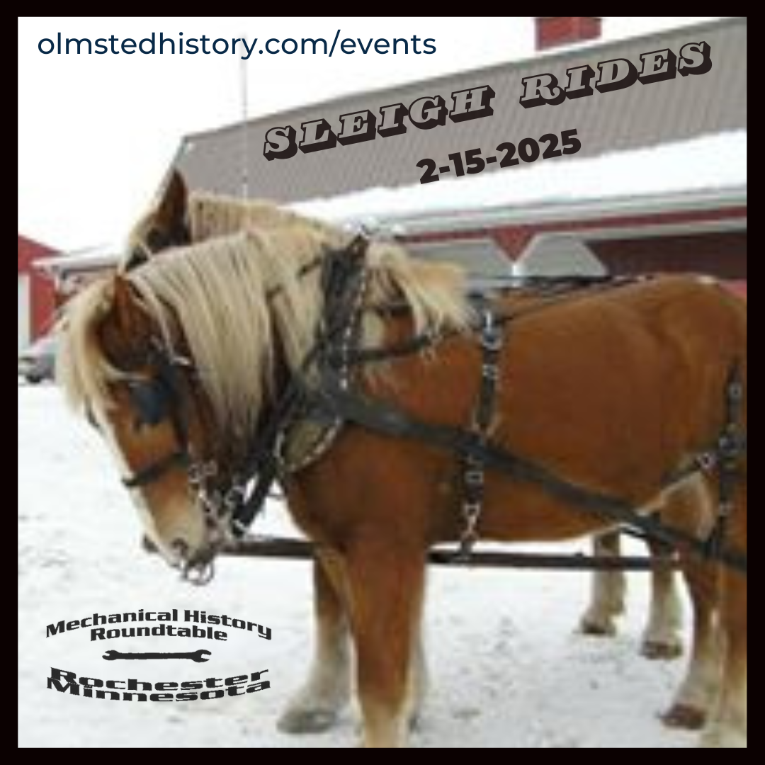 It's that time of year again! Join us for sleigh rides at the Ralph Stoppel Farmstead on Salem Road SW behind the History Center of Olmsted County on February 15, 2025 from 10 - 4pm. Free will donation with all proceeds donated to the Special Olympics. Bring the family for hot chocolate and cookies and ride as many times as you would like! Thanks to the Mechanical History Round Table for this special event.