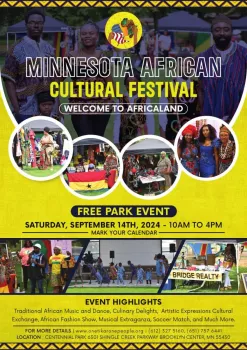 GET READY FOR THE MINNESOTA AFRICAN CULTURAL FESTIVAL! Event Highlights (FREE PARK EVENT) Traditional African Music and Dance, Culinary Delights, Artistic Expressions Cultural Exchange, Fashion Show, Musical Extravaganza, Soccer Match, and Much More…