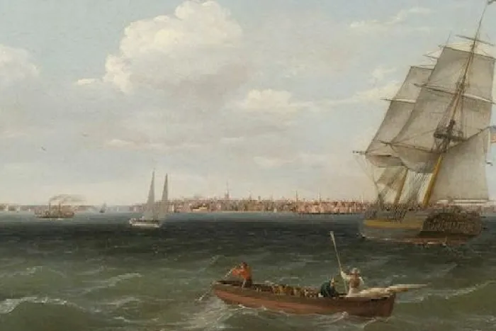 The Coast & the Sea: Marine and Maritime Art in America is a traveling exhibition organized by the The New York Historical featuring 49 paintings and 10 maritime objects from their immense collection relating the story of early American culture and history. The exhibition is organized into several chronological themes exploring America’s relationship with water. Paintings dating from 1750 to 1904 include seascapes, ship portraits, harbors, storms, naval battles, shipwrecks, as well scenes of leisure and portraits of historic people along with personal possessions such as navigational instruments, scrimshaw, medals, and snuffboxes. Many of America’s most prominent marine and portrait artists, including Thomas Birch, Thomas Buttersworth, Jasper Francis Cropsey, John Frderick Kensett, Edward Moran, Rembrandt Peale, Howard Pyle and Francis Augustus Silva are represented in the exhibit.