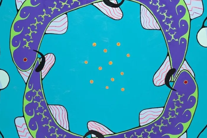 Coons notes “Woodland Art style images are not a religion but a way of life. Stories of the images were told during the time when the Ojibwa people would gather in lodges during the season of snow. The stories are for teaching your role in the community and on how to participate in the Ojibwa community.”