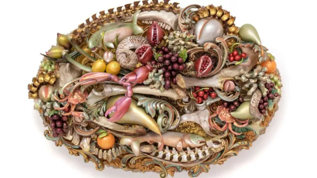 Rochester, Minnesota’s Judy Onofrio creates larger than life sculptures that are covered with collaged bones, glass orbs, thousands of beads, and intricate glass mosaics. Her Baroque flourishes celebrate life’s color, matching perfectly with her sense of humor and creative spirit. It is through her accumulative process that Judy continues to push the boundaries of art and craft, especially how she shares the history that objects contain. The ambitious works in Deep Dive are inspired by underwater flora and fauna, while reflecting on her childhood and earliest memories of living near the ocean.