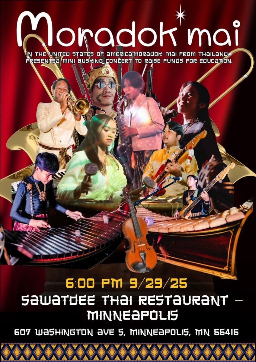 Join us over dinner for music performed by Moradok Mai, a performing arts school in Thailand. The performance will include traditional and contemporary Thai music. Call us for reservations.