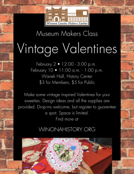 The first Museum Makers Class of the year is coming up! Join WCHS member and volunteer, Lori Ortega, in creating vintage inspired Valentines on Sunday, February 2, 12:00 p.m. - 3:00 p.m. or on Monday, February 10, 11:00 a.m. - 1:00 p.m. Cost is just $3 for members and $5 for non-members. All the supplies are provided. Register for one or more of the upcoming Vintage Valentine Classes at winonahistory.org, by calling 507-454-2723 ext. 0, or stopping in the History Center. You can pay at the History Center Tickets Desk upon arrival. This class is an open-house style, so you are welcome to come anytime during the listed class times, but allow time to make your Valentine. We will be done at the end time. Walk-ins are welcome but those registered will be guaranteed a spot. Space is limited. Open for all ages, but best for those 6 and older. Adults must accompany children.