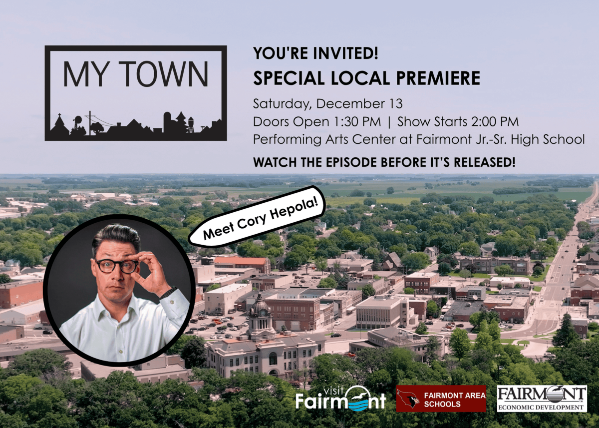 YOU are invited to a special premiere showing of My Town Series on Saturday, December 13 at 2PM! Watch the episode ONE WEEK EARLY at the Performing Arts Center at Fairmont Jr.-Sr. High School. Special guest Cory Hepola will be there to join the celebration!