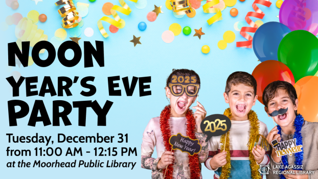 Join the library for a kid-friendly "Noon Year's Eve" celebration, complete with a balloon drop at noon! Celebrate New Year's Eve with your child without having to wake them up at midnight! The Moorhead Public Library will offer a "Noon Year's Eve" celebration including crafts, activities, and a balloon drop at noon! This program is geared for youth ages 10 and under.