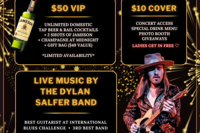 Join us for a night of epic blues music with The Dylan Salfer Band — a returning NYE favorite and 2025 award-winner of the International Blues Challenge. Celebrate with fantastic people, ice-cold drinks, and an unforgettable performance from musicians who've shared the stage with some of the greatest blues and rock legends in the world.